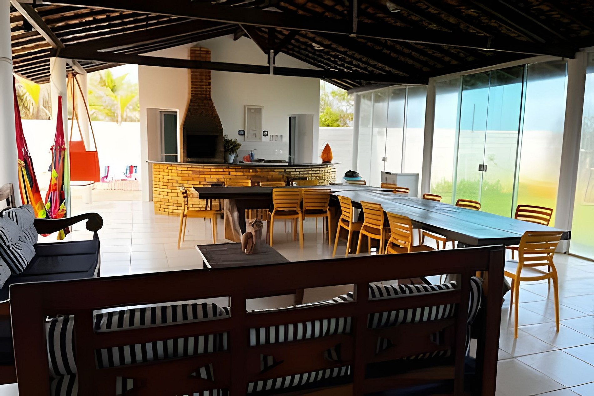- Churrasqueira com área de jantar, sofás e poltronas, tudo bem ao lado da piscina