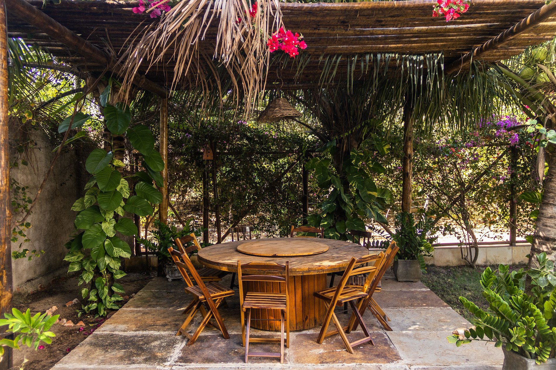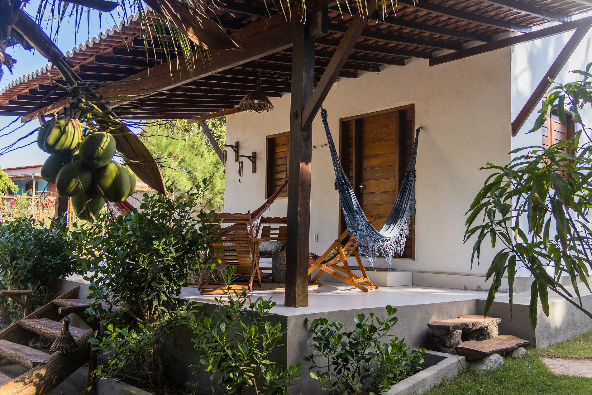 A casa possui uma varanda com pufes e redes com vista para o jardim, uma pequena sala de estar e cozinha completa.